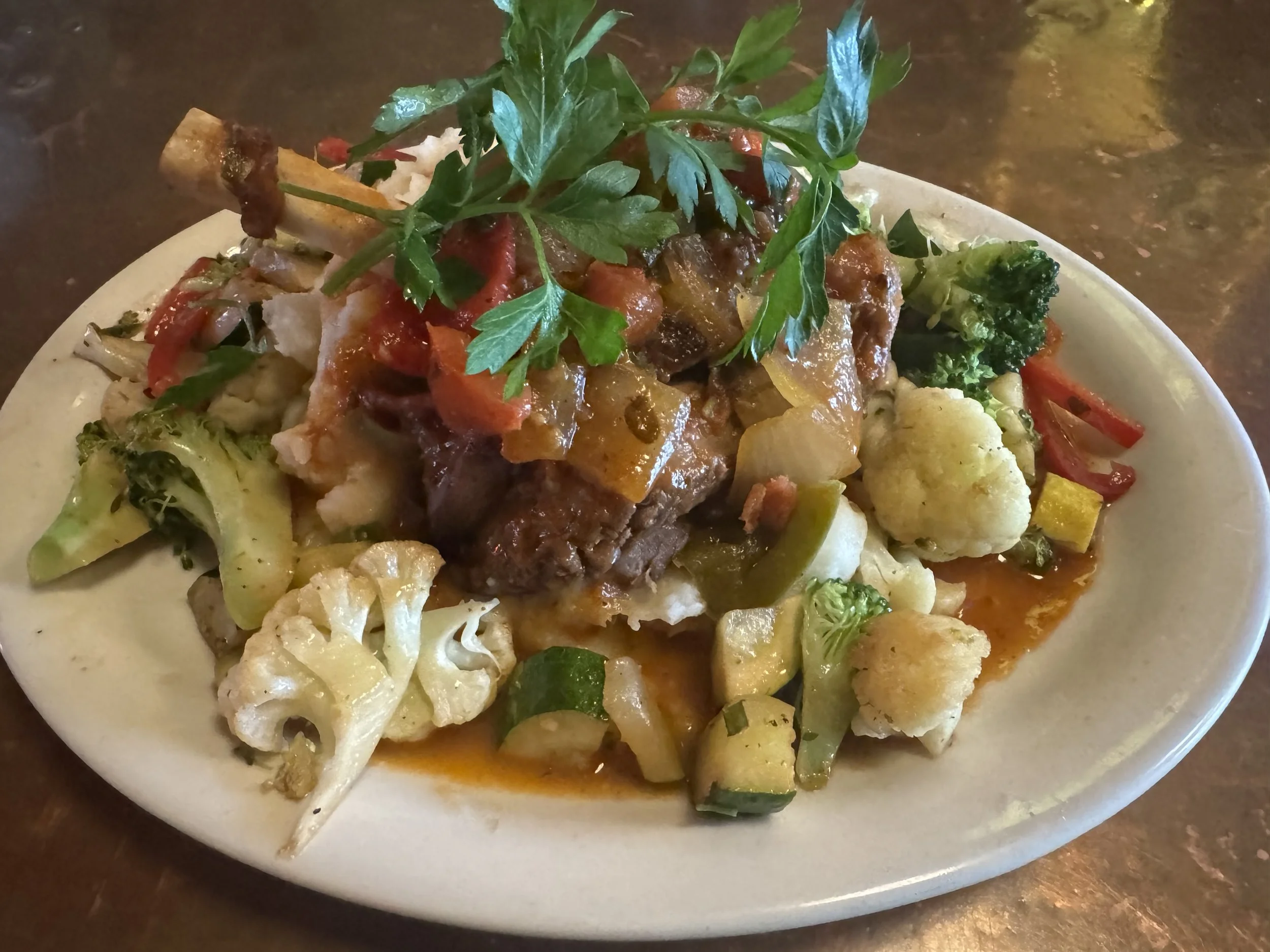 Slow cooked tender lamb shank over mashed potato served with vegetables $35