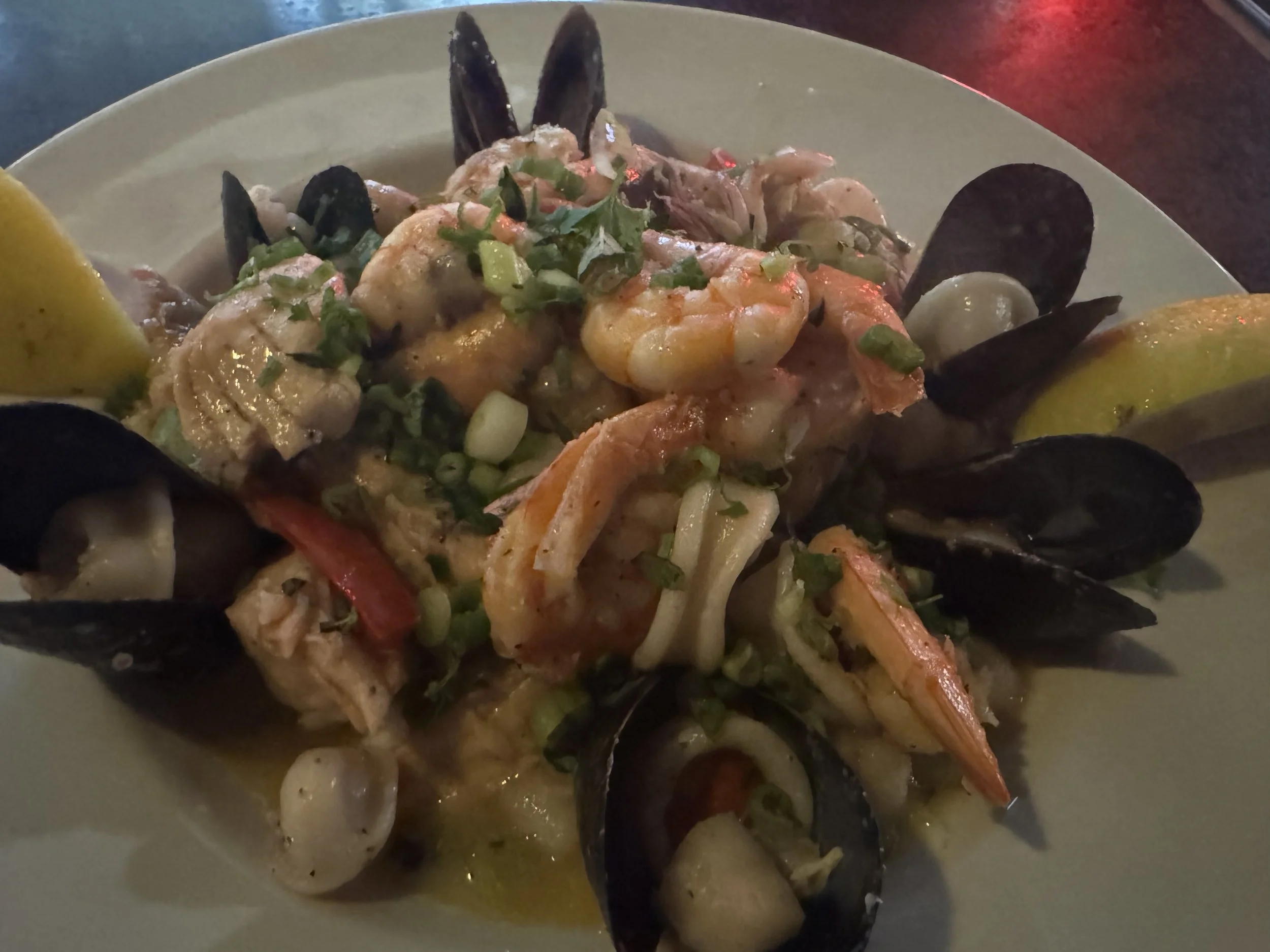 Seafood stew with mussels, seasonal fish, shrimp, calamari and scallops $32